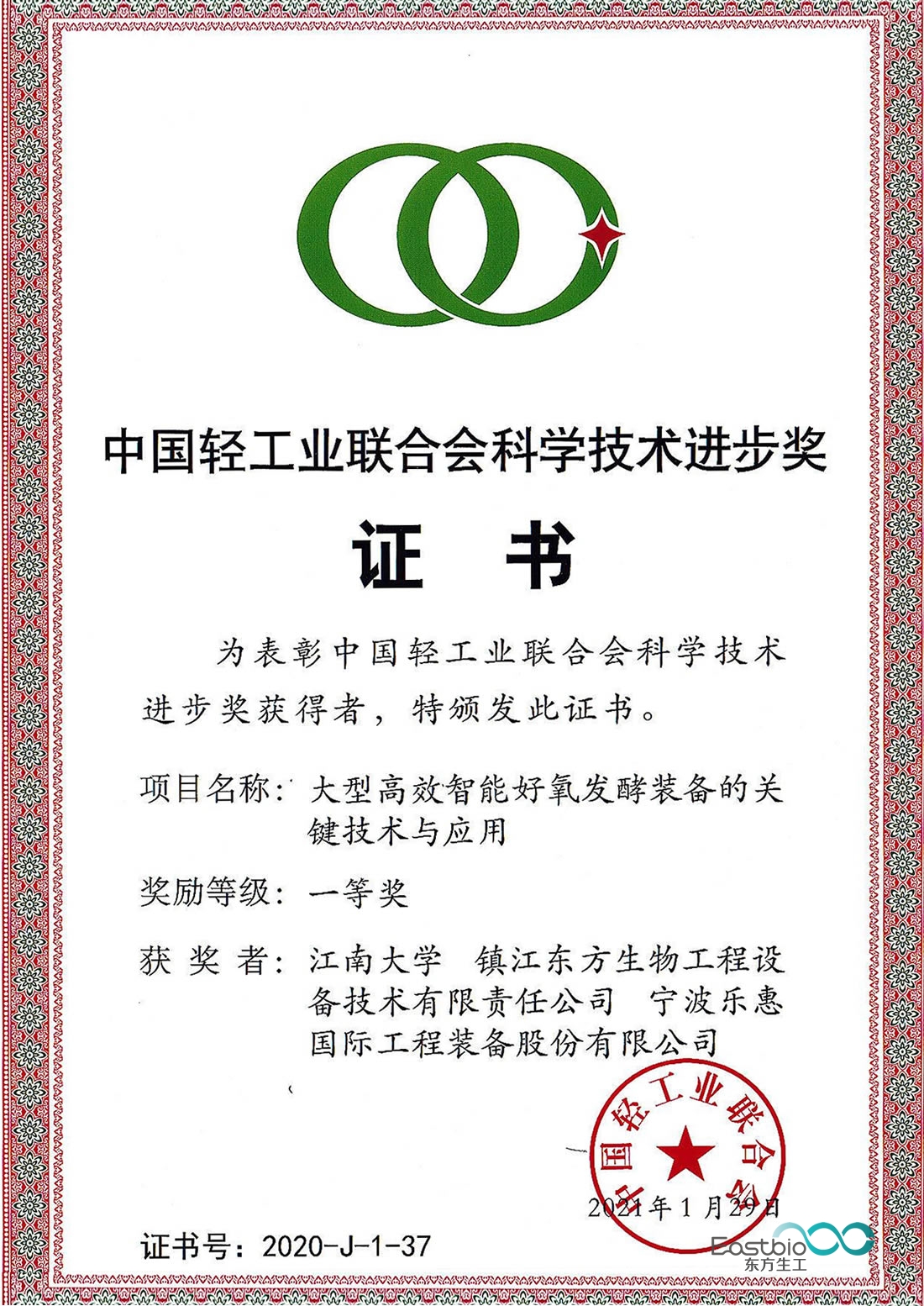 东方生工与江南大学等单位合作完成的“大型高效智能好氧发酵装备的关键技术与应用”获得2020年度中国轻工业联合会科学技术进步奖一等奖。