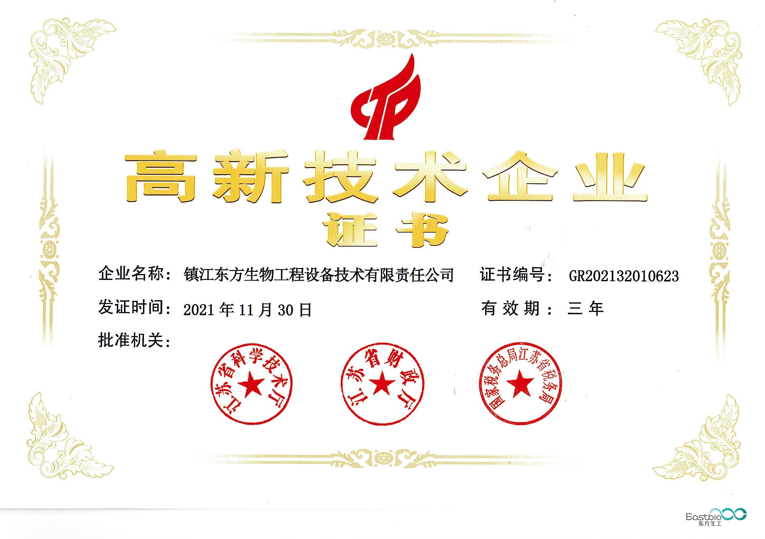 东方生工于2021年顺利通过高企复审,获颁新的高新技术企业证书已于近日下发到公司。